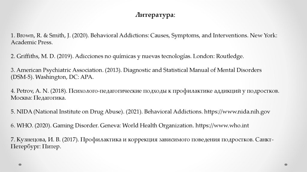 Литература:1. Brown, R. & Smith, J. (2020). Behavioral Addictions: Causes, Symptoms, and Interventions. New York: