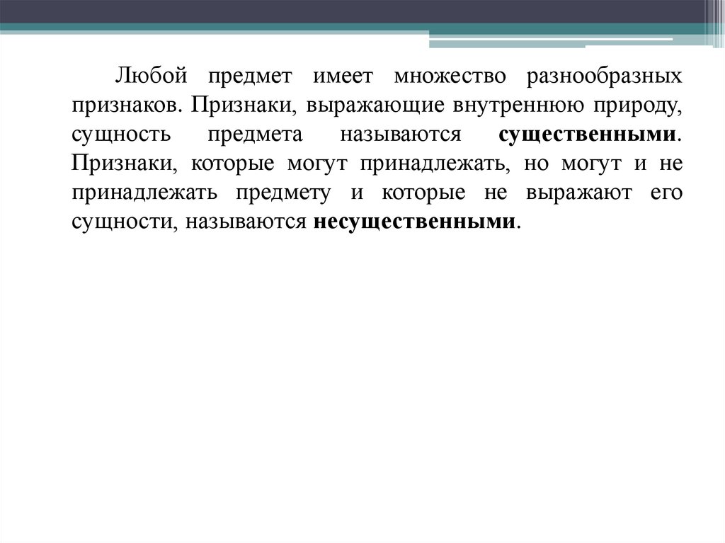 Любой предмет имеет множество разнообразныхпризнаков. Признаки, выражающие внутреннюю природу,