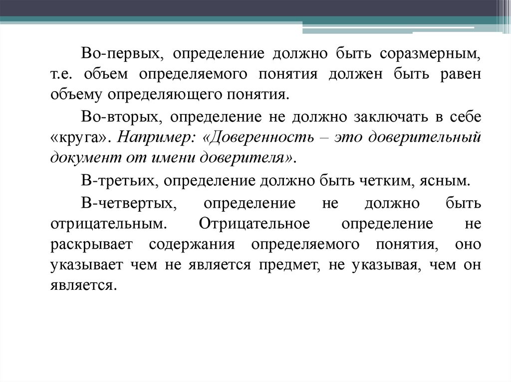 Во-первых, определение должно быть соразмерным,т.е. объем определяемого понятия должен быть равен