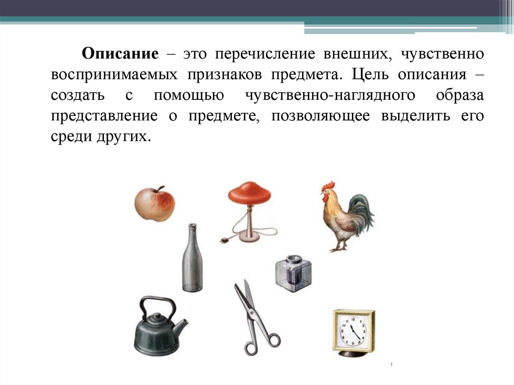 Описание – это перечисление внешних, чувственновоспринимаемых признаков предмета. Цель описания –