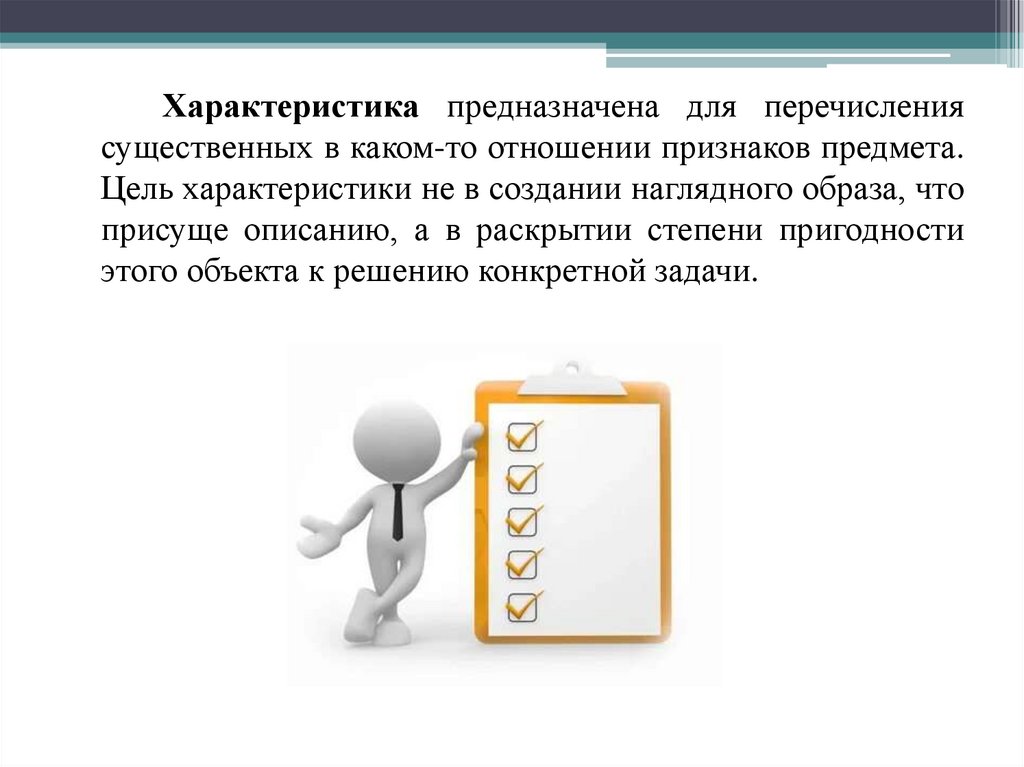 Характеристика предназначена для перечислениясущественных в каком-то отношении признаков предмета.