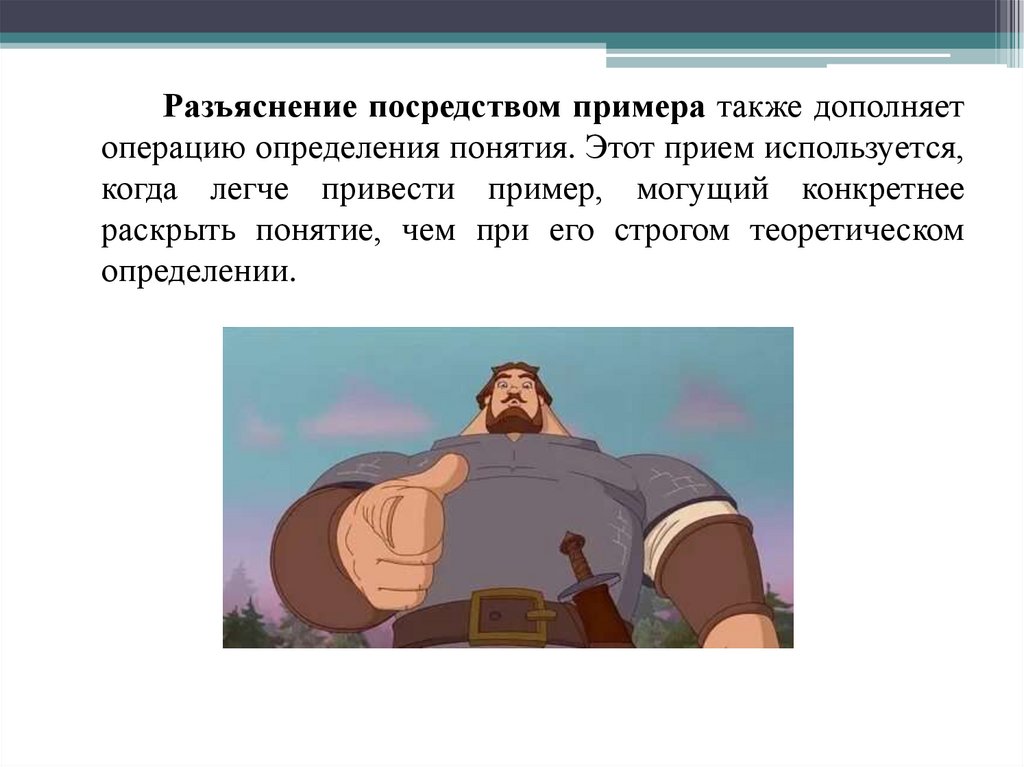 Разъяснение посредством примера также дополняетоперацию определения понятия. Этот прием используется,