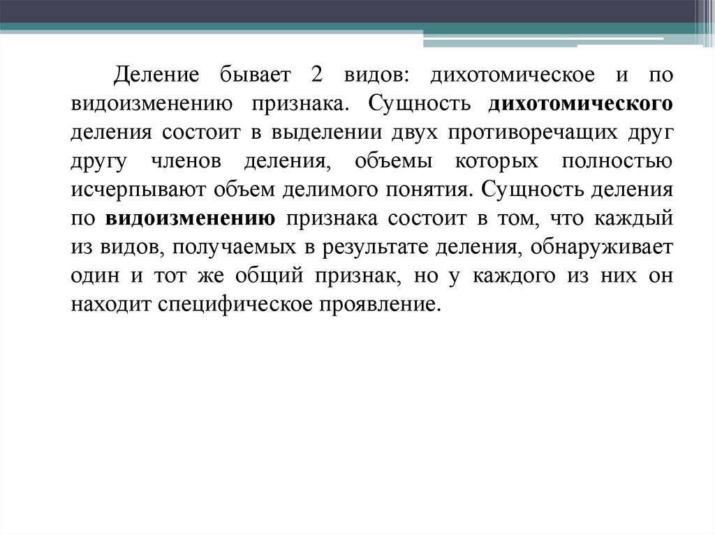 Деление бывает 2 видов: дихотомическое и повидоизменению признака. Сущность дихотомического