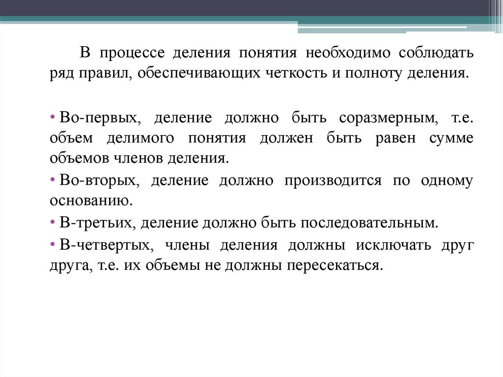 В процессе деления понятия необходимо соблюдатьряд правил, обеспечивающих четкость и полноту деления.