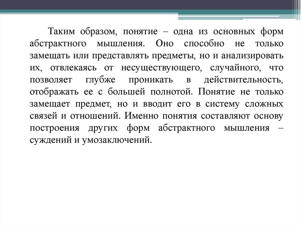 Таким образом, понятие – одна из основных формабстрактного мышления. Оно способно не только
