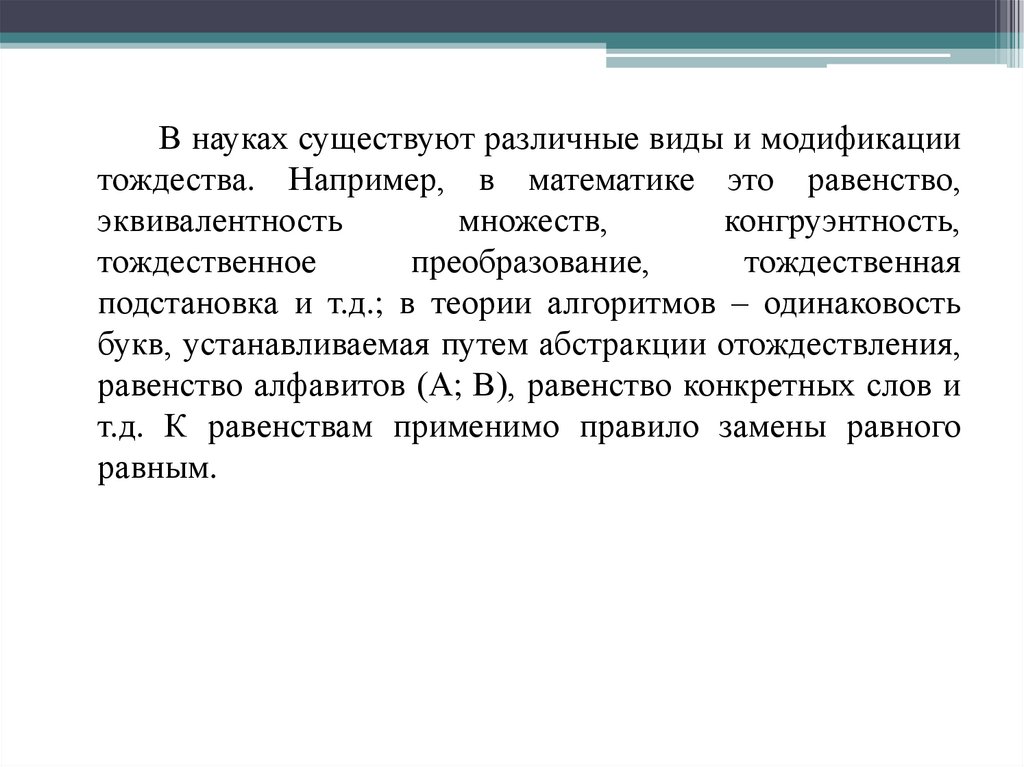 В науках существуют различные виды и модификациитождества. Например, в математике это равенство,