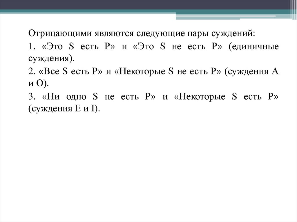 Отрицающими являются следующие пары суждений:1. «Это S есть Р» и «Это S не есть Р» (единичные