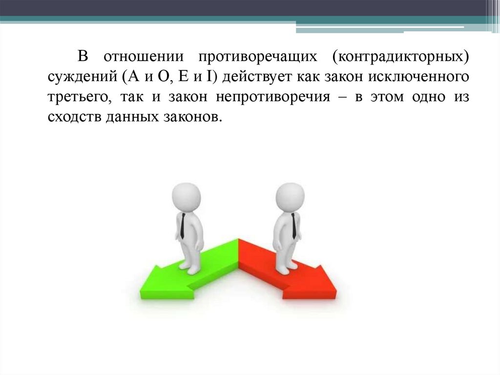 В отношении противоречащих (контрадикторных)суждений (А и О, Е и I) действует как закон исключенного