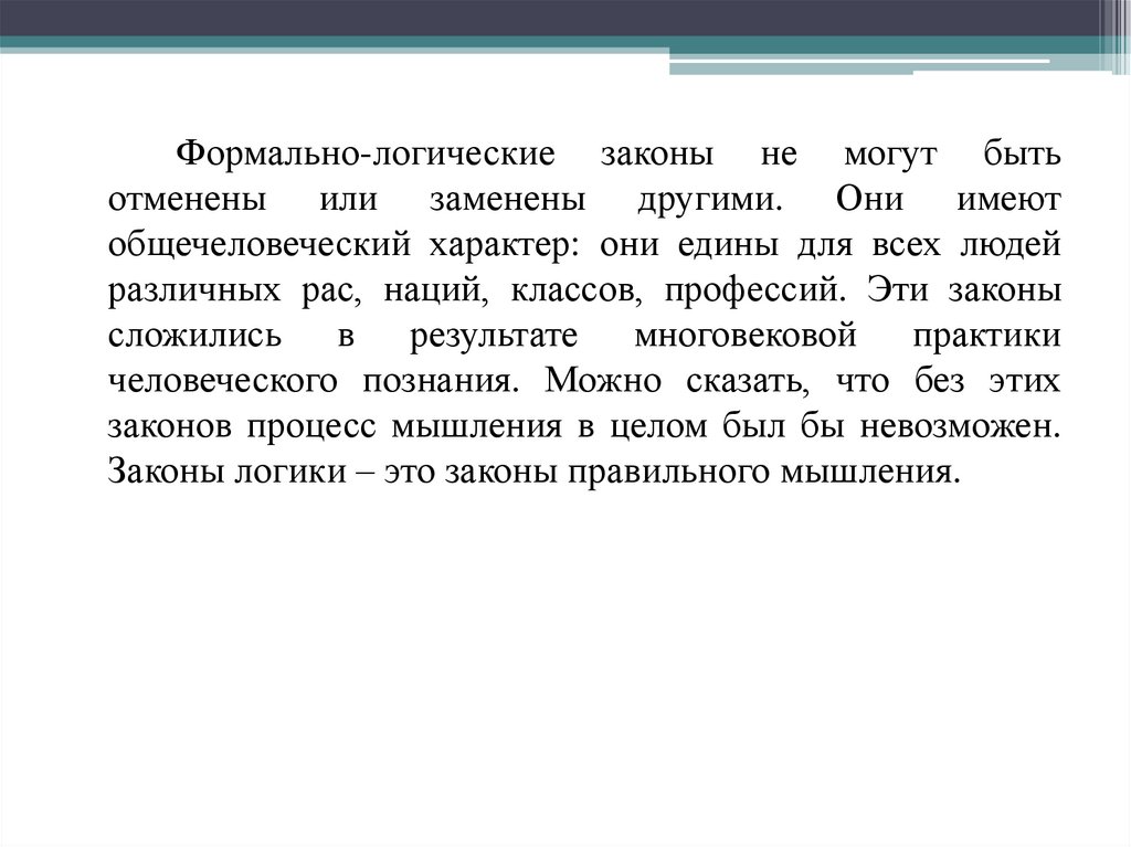 Формально-логические законы не могут бытьотменены или заменены другими. Они имеют