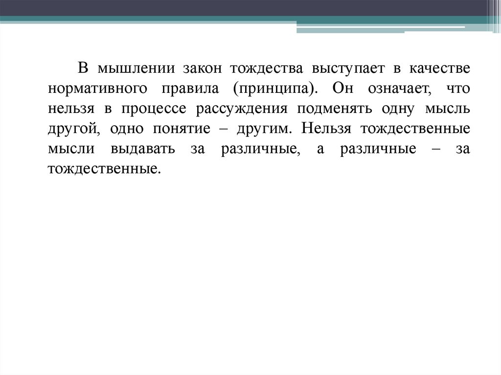 В мышлении закон тождества выступает в качественормативного правила (принципа). Он означает, что