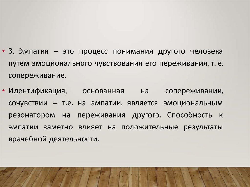 • 3. Эмпатия – это процесс понимания другого человекапутем эмоционального чувствования его переживания, т. е.