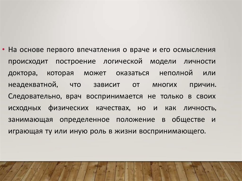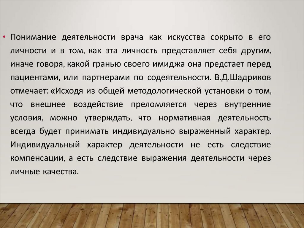 • Понимание деятельности врача как искусства сокрыто в еголичности и в том, как эта личность представляет себя другим,