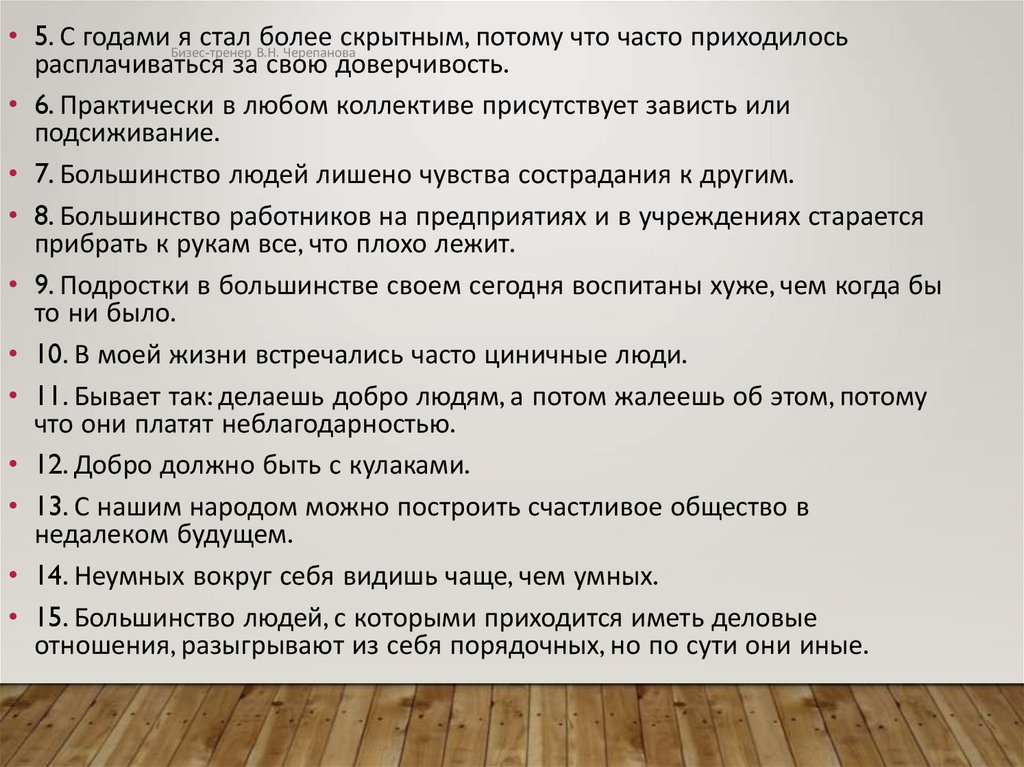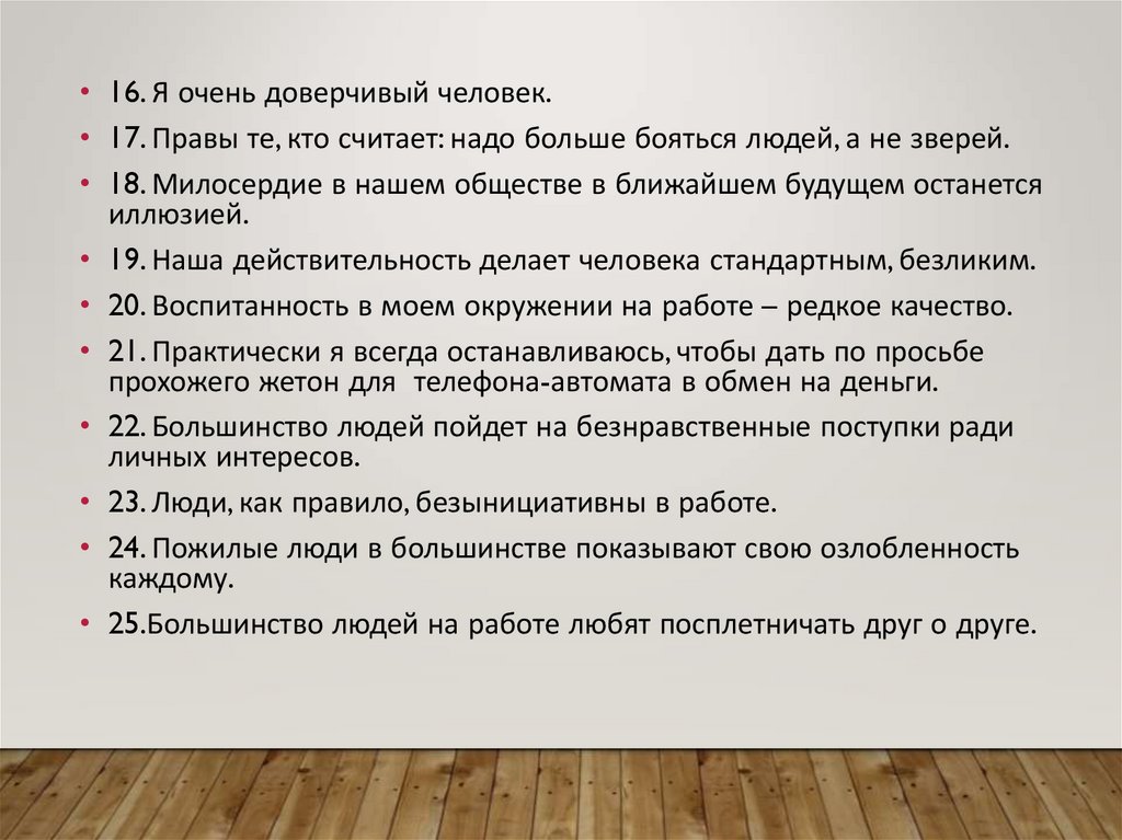 • 16. Я очень доверчивый человек.• 17. Правы те, кто считает: надо больше бояться людей, а не зверей.
