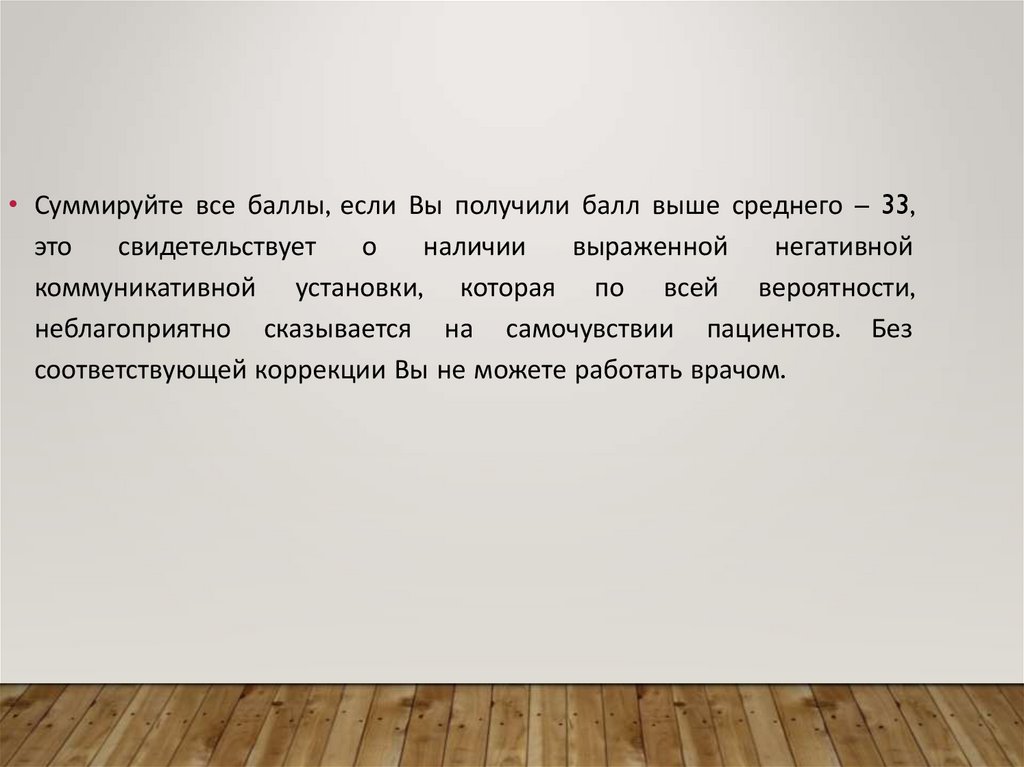 • Суммируйте все баллы, если Вы получили балл выше среднего – 33,это