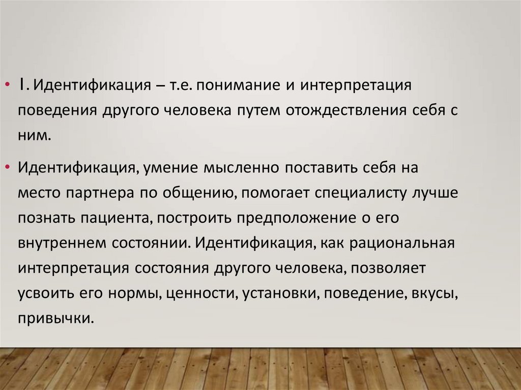 • 1. Идентификация – т.е. понимание и интерпретацияповедения другого человека путем отождествления себя с
