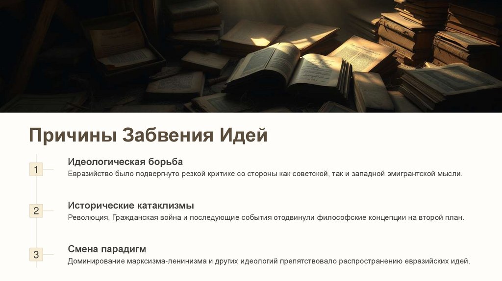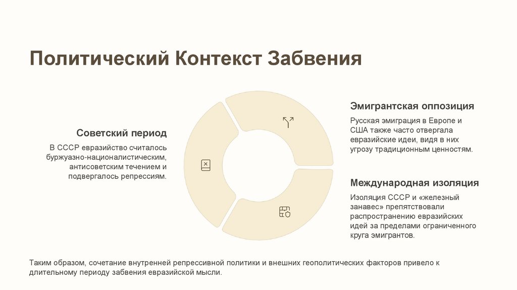 Доминирование марксизма-ленинизма и других идеологий препятствовало распространению евразийских идей.