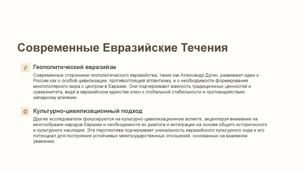 Современные сторонники геополитического евразийства, такие как Александр Дугин, развивают идеи о