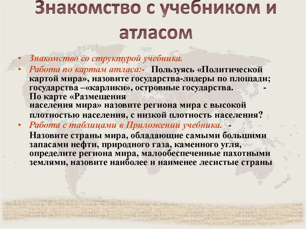 • Знакомство со структурой учебника.• Работа по картам атласа:- Пользуясь «Политической