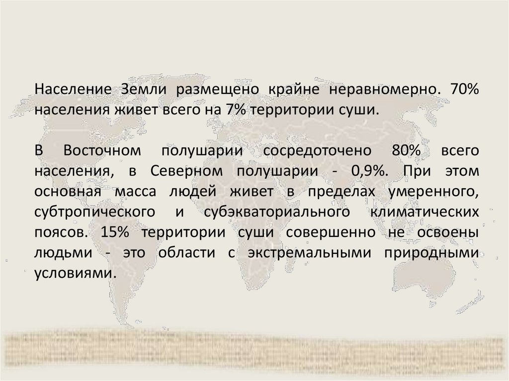 Население Земли размещено крайне неравномерно. 70%населения живет всего на 7% территории суши.
