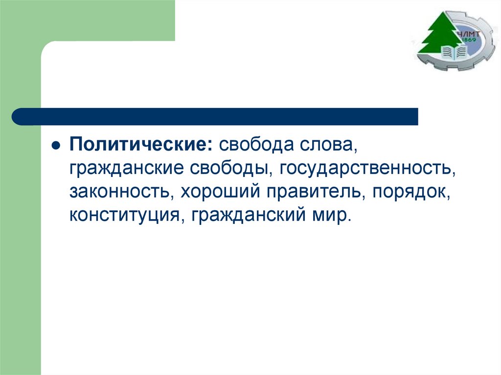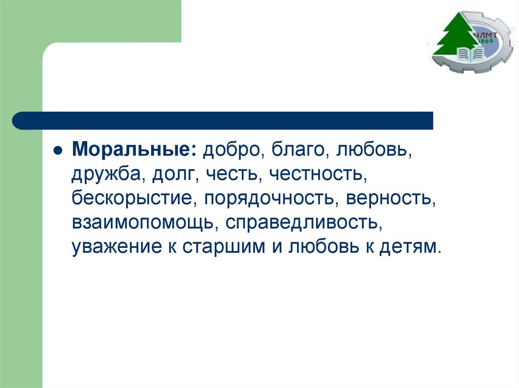 Моральные: добро, благо, любовь,дружба, долг, честь, честность,