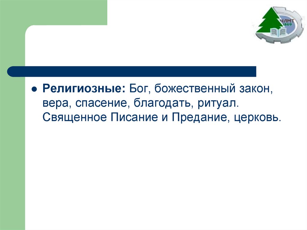 Религиозные: Бог, божественный закон,вера, спасение, благодать, ритуал.