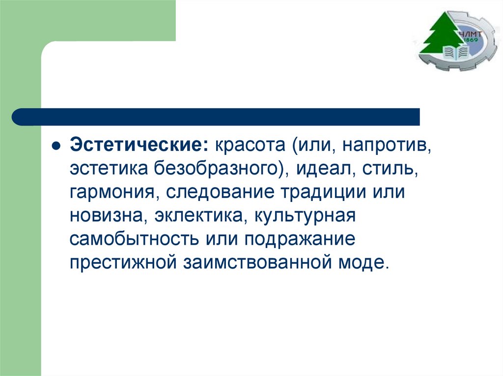 Эстетические: красота (или, напротив,эстетика безобразного), идеал, стиль,