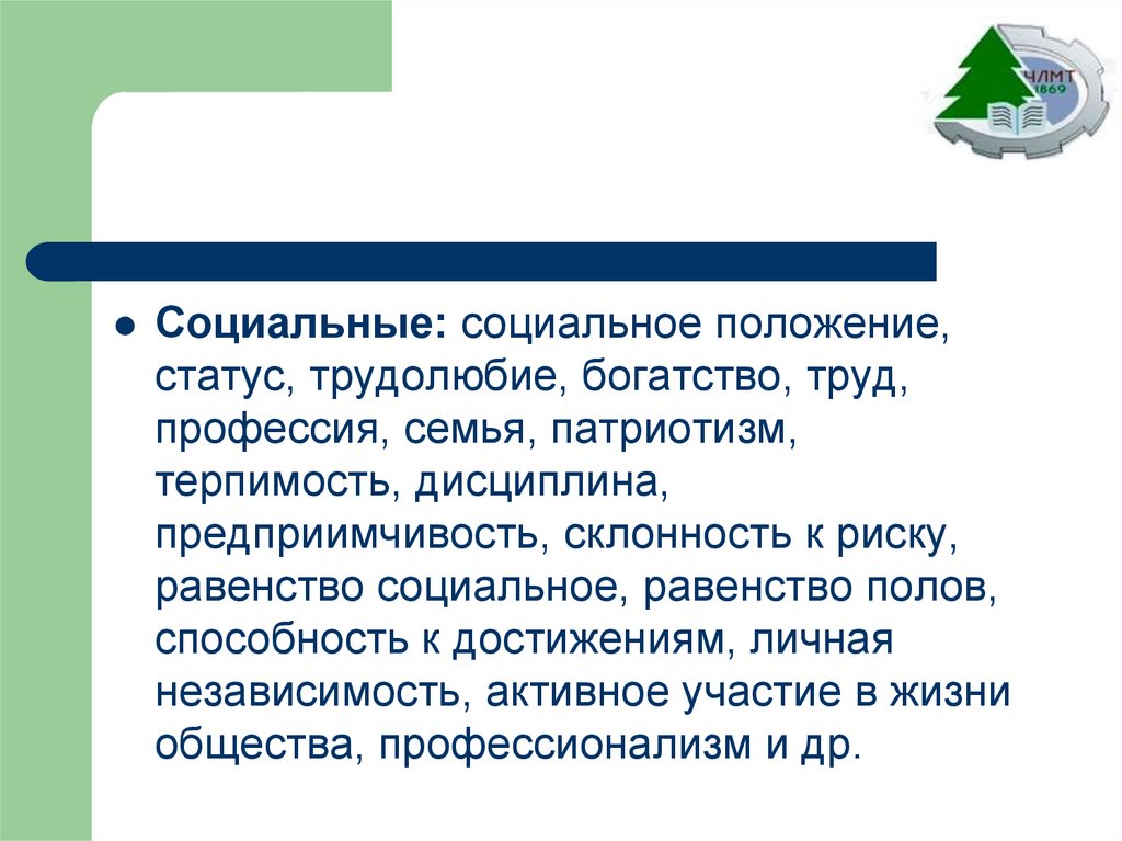 Социальные: социальное положение,статус, трудолюбие, богатство, труд,