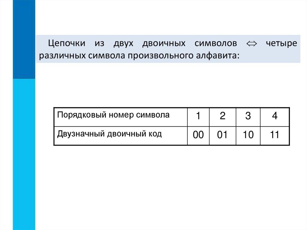 Цепочки из двух двоичных символов четыреразличных символа произвольного алфавита: