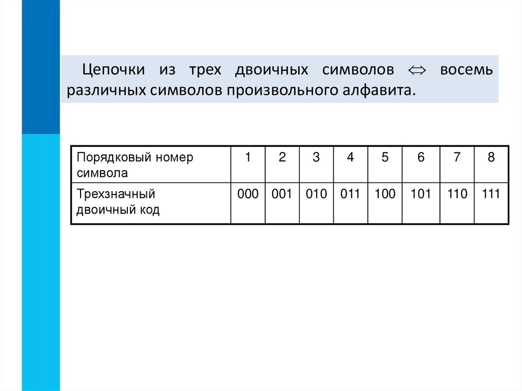 Цепочки из трех двоичных символов восемьразличных символов произвольного алфавита.