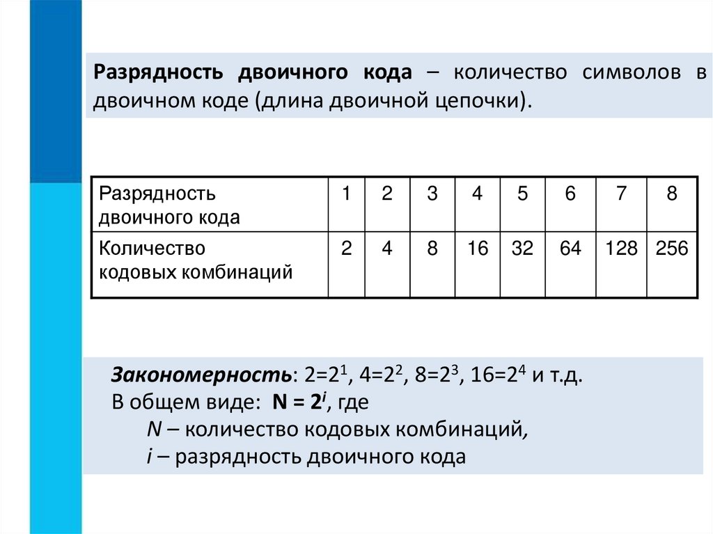 Разрядность двоичного кода – количество символов вдвоичном коде (длина двоичной цепочки).