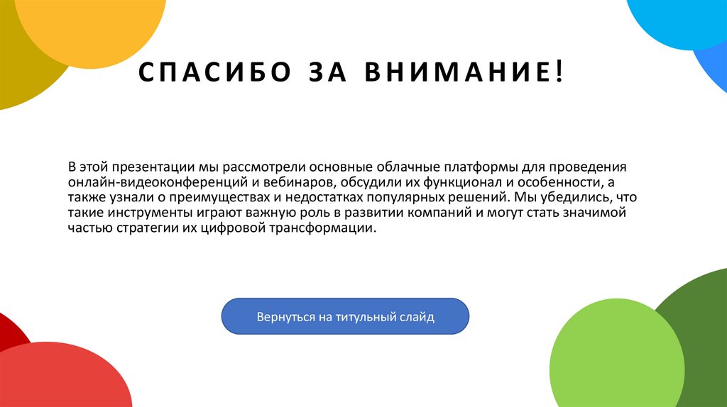 СПАСИБО ЗА ВНИМАНИЕ!В этой презентации мы рассмотрели основные облачные платформы для проведения