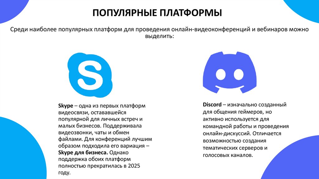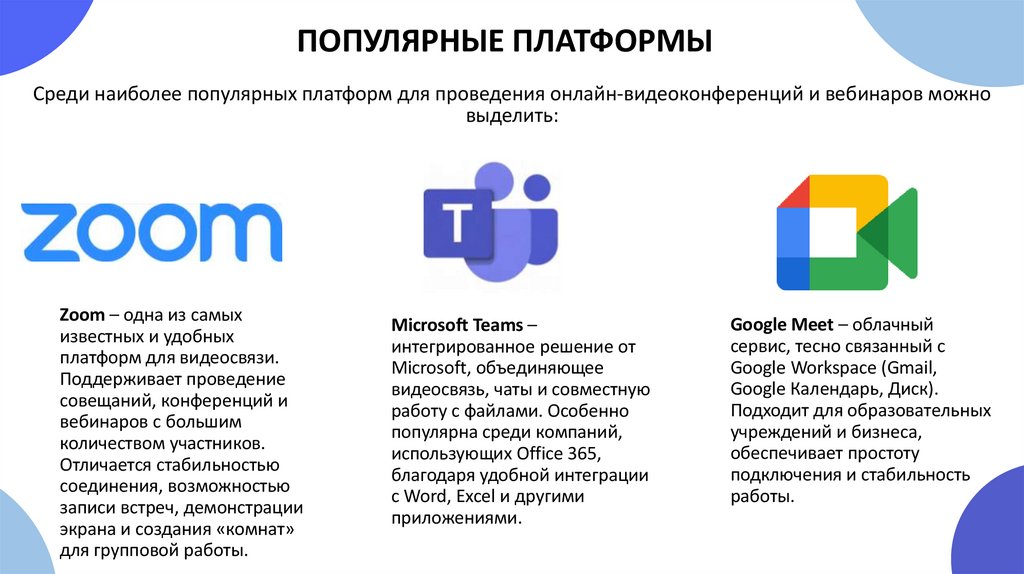 ПОПУЛЯРНЫЕ ПЛАТФОРМЫСреди наиболее популярных платформ для проведения онлайн-видеоконференций и вебинаров можно