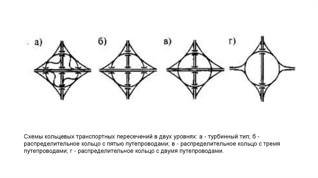 Схемы кольцевых транспортных пересечений в двух уровнях: а - турбинный тип; б распределительное кольцо с пятью путепроводами; в - распределительное кольцо с тремяпутепроводами; г - распределительное кольцо с двумя путепроводами.