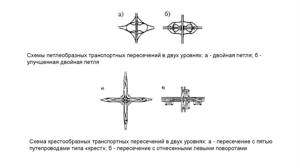 Схемы петлеобразных транспортных пересечений в двух уровнях: а - двойная петля; б улучшенная двойная петляСхема крестообразных транспортных пересечений в двух уровнях: а - пересечение с пятью