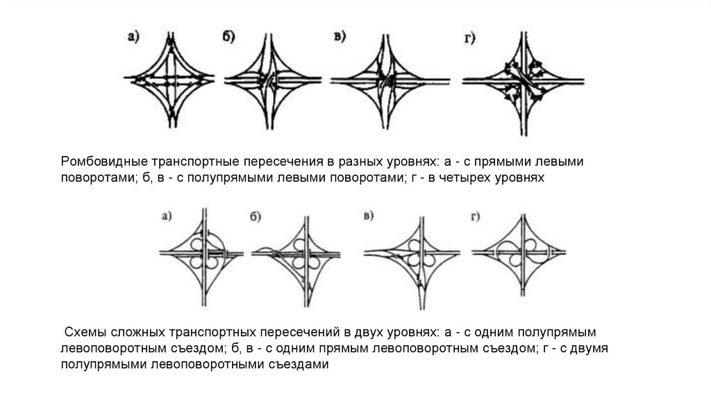 Ромбовидные транспортные пересечения в разных уровнях: а - с прямыми левымиповоротами; б, в - с полупрямыми левыми поворотами; г - в четырех уровнях