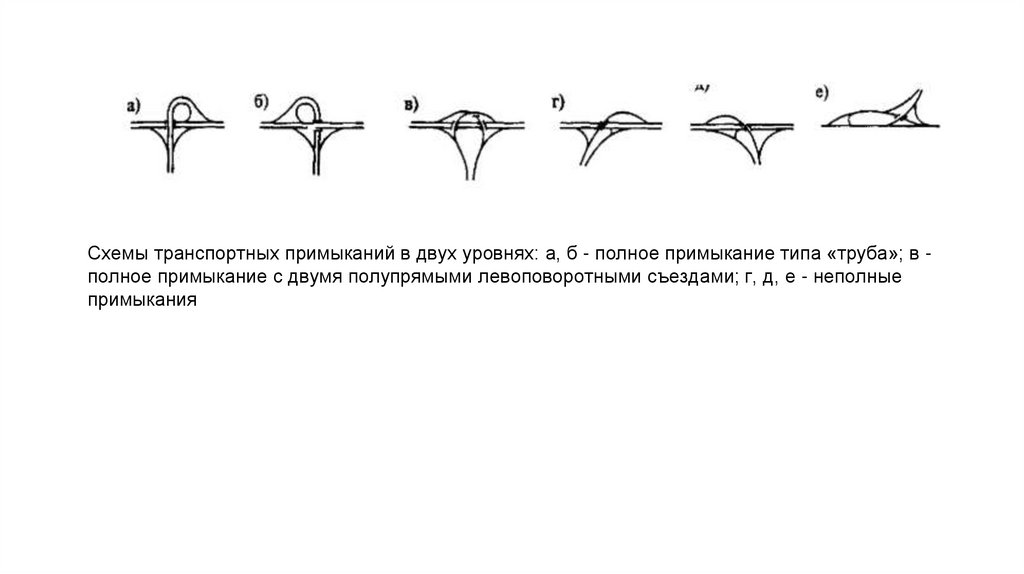 Схемы транспортных примыканий в двух уровнях: а, б - полное примыкание типа «труба»; в полное примыкание с двумя полупрямыми левоповоротными съездами; г, д, е - неполныепримыкания