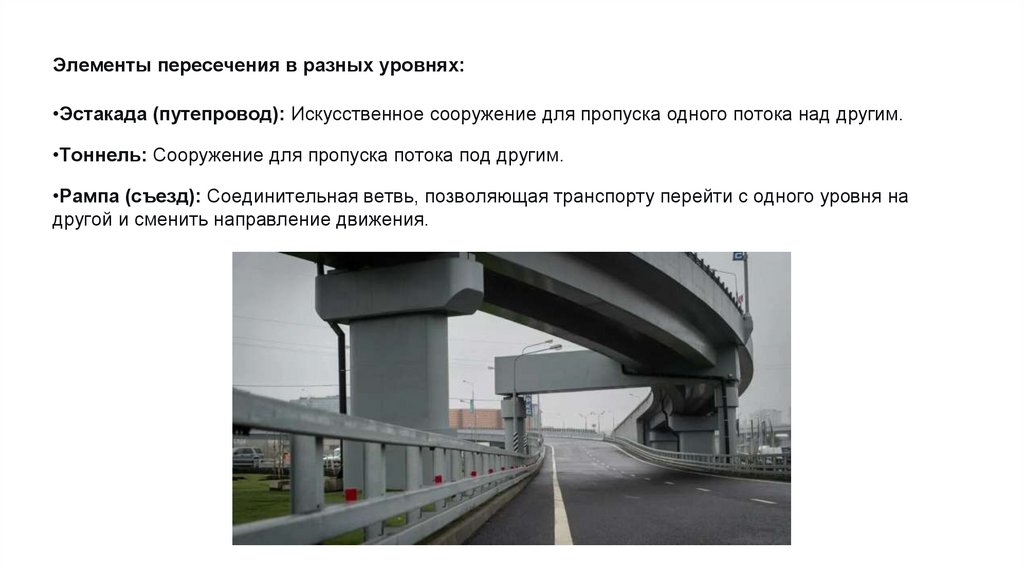 Элементы пересечения в разных уровнях:•Эстакада (путепровод): Искусственное сооружение для пропуска одного потока над другим.