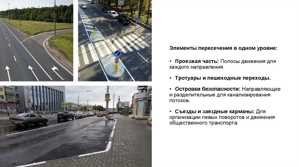 Элементы пересечения в одном уровне:• Проезжая часть: Полосы движения для
