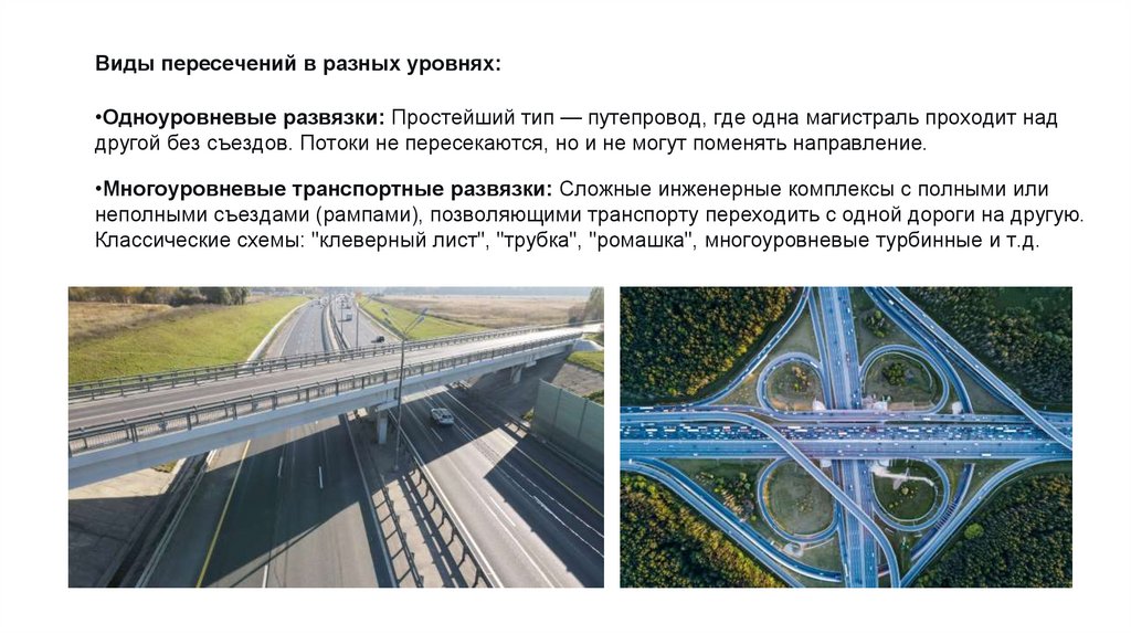 Виды пересечений в разных уровнях:•Одноуровневые развязки: Простейший тип — путепровод, где одна магистраль проходит над