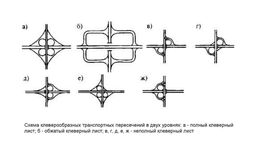 Схема клеверообразных транспортных пересечений в двух уровнях: а - полный клеверныйлист; б - обжатый клеверный лист; в, г, д, е, ж - неполный клеверный лист