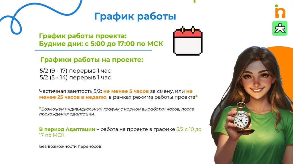 В период Адаптации – работа на проекте в графике 5/2 с 10 до