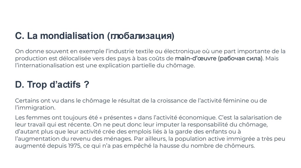 C. La mondialisation (глобализация)On donne souvent en exemple l’industrie textile ou électronique où une part importante de la