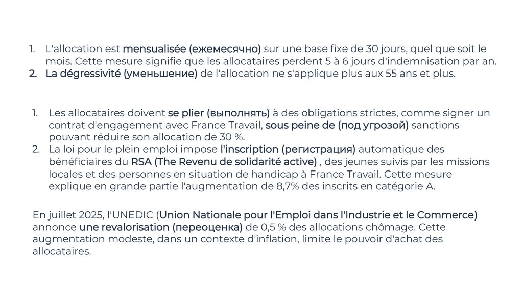 annonce une revalorisation (переоценка) de 0,5 % des allocations chômage. Cette