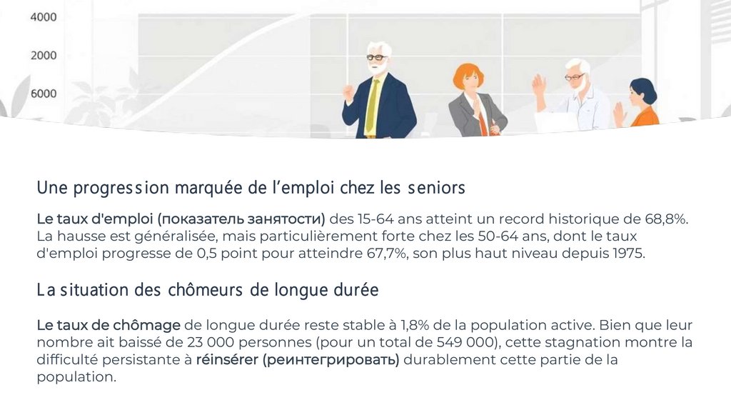 Une progres s ion marquée de l’emploi chez les s eniorsLe taux d'emploi (показатель занятости) des 15-64 ans atteint un record historique de 68,8%.