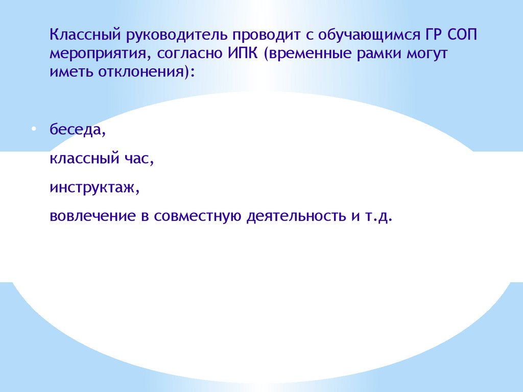 Классный руководитель проводит с обучающимся ГР СОПмероприятия, согласно ИПК (временные рамки могут