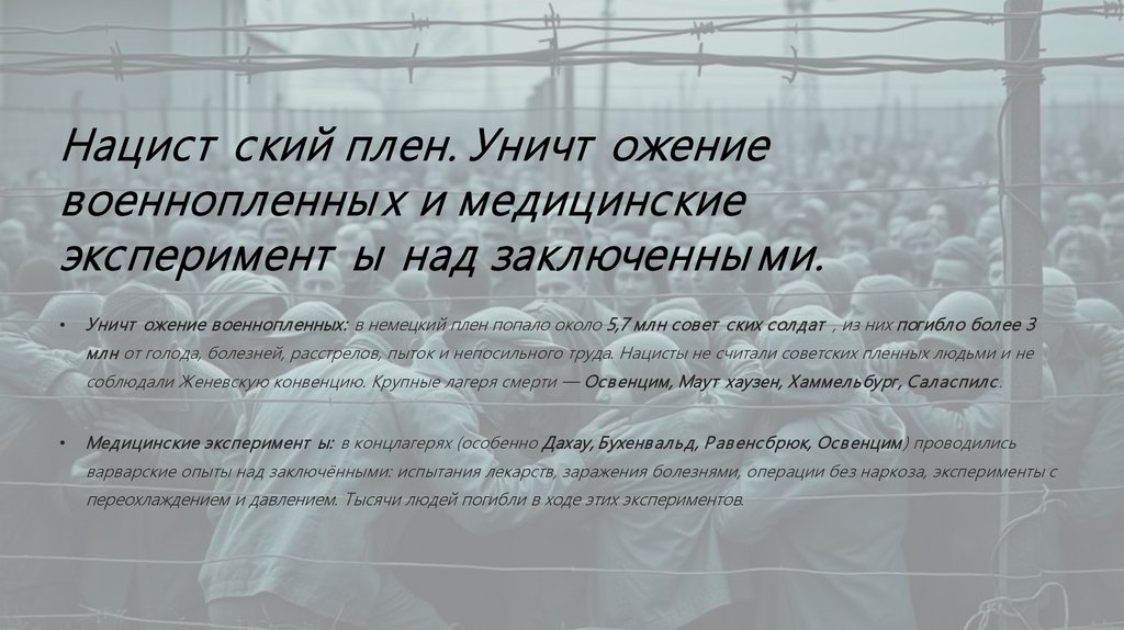 Медицинские эксперимент ы: в концлагерях (особенно Дахау, Бухенвальд, Равенсбрюк, Освенцим) проводились