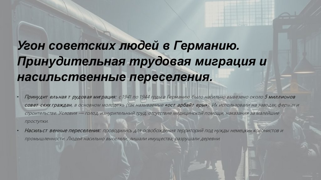 Принудит ельная т рудовая миграция: с 1941 по 1944 годы в Германию было насильно вывезено около 5 миллионов