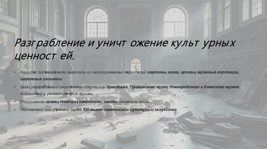 Были разграблены и уничтожены сокровища Эрмитажа, Пушкинского музея, Новгородского и Киевского музеев,