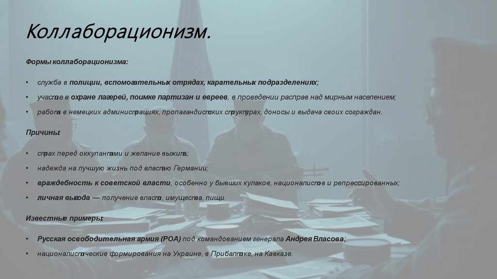 работа в немецких администрациях, пропагандистских структурах, доносы и выдача своих сограждан.