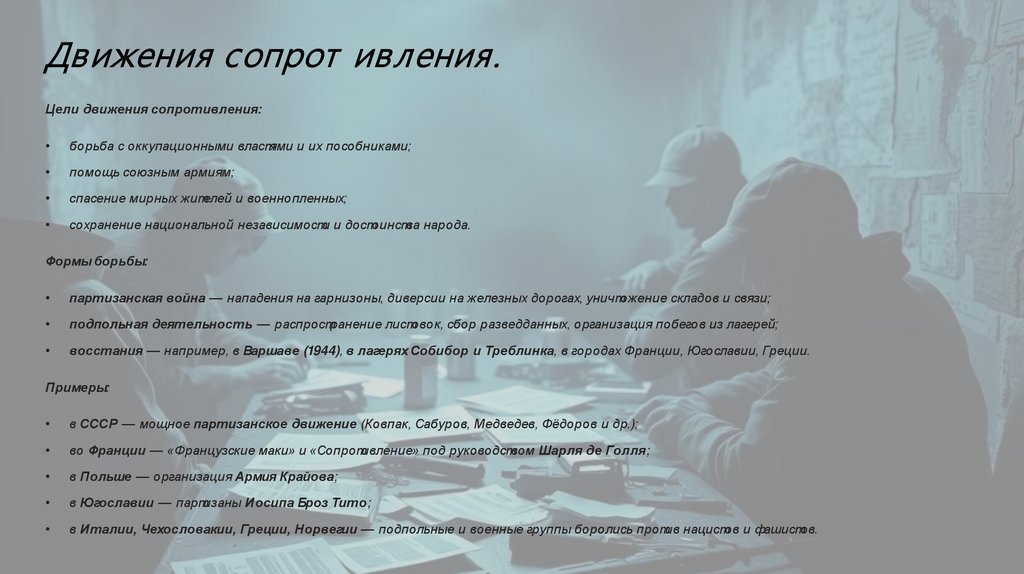 в Италии, Чехословакии, Греции, Норвегии — подпольные и военные группы боролись против нацистов и фашистов.